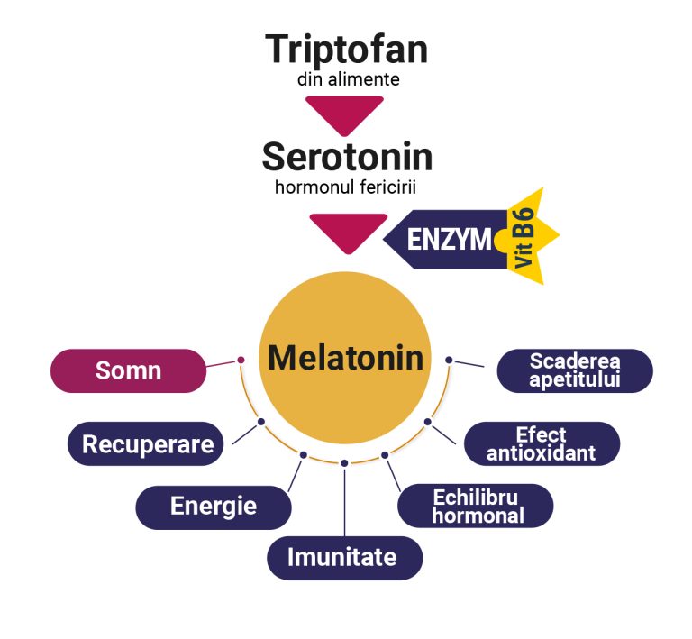 Enzima care transformă serotonina în melatonină este activă doar în întuneric și are nevoie de vitamina B6. Dacă nu obținem suficientă vitamina B6 din alimentație, ne alegem cu deficit de melatonină și tulburări de somn.